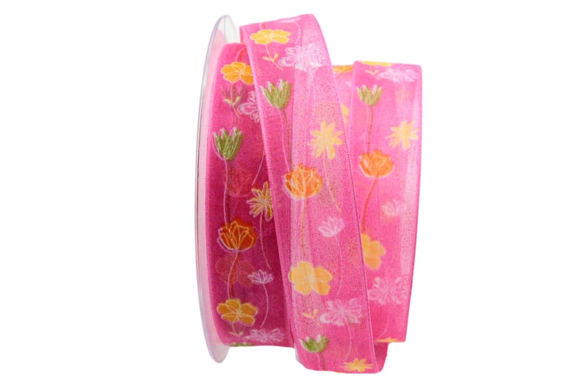 Ein sehr schönes, farbenfrohes Geschenkband mit Blumendruck. Dieses Organzaband mit Druck wirkt sehr schön fein aber trotzdem farbenfroh für jede Dekoration oder Verpackung in der Frühjahrs- und Sommerzeit