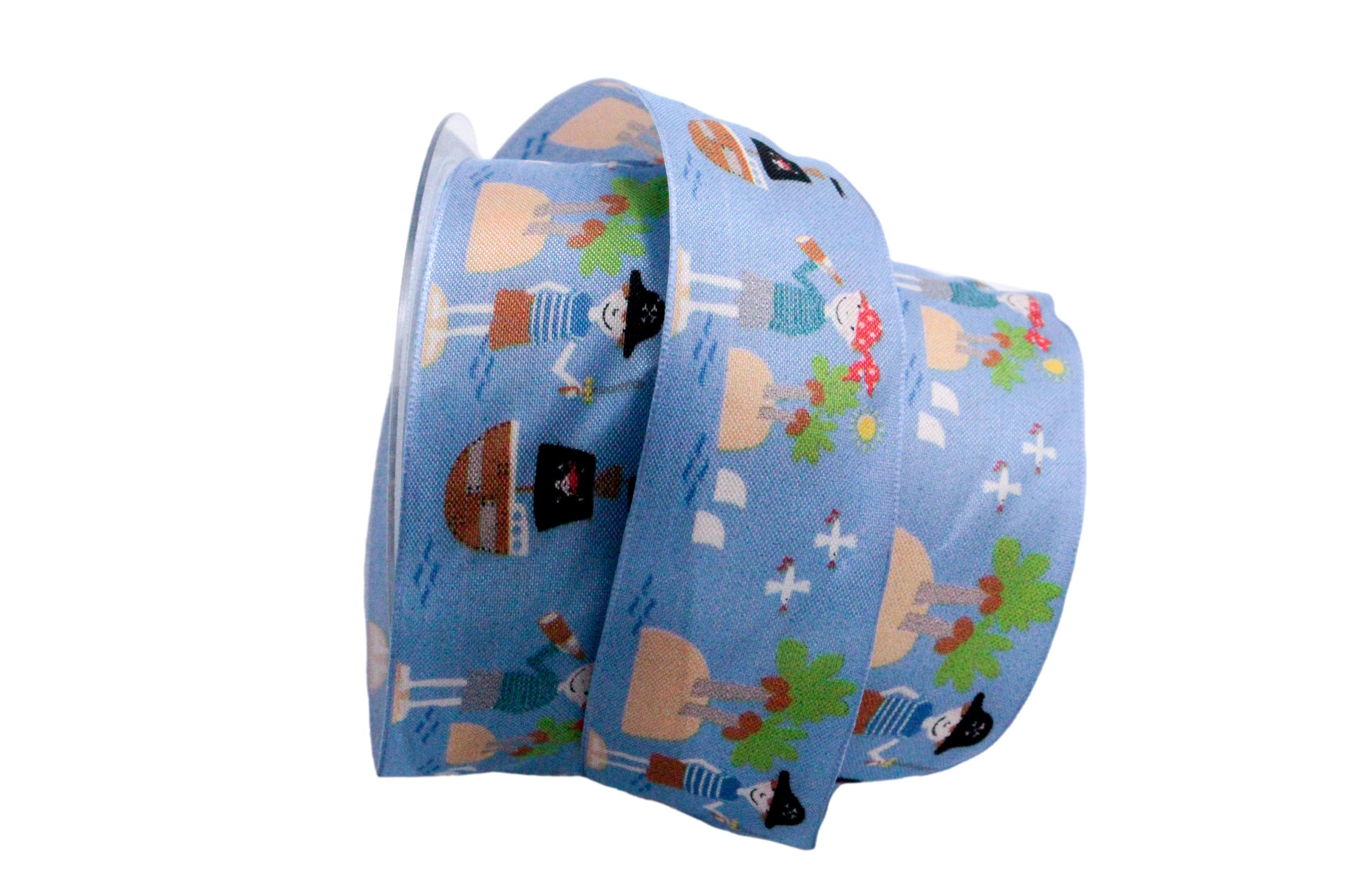 Ein fröhliches Dekoband mit Inselmotiv, Piratenmotiv, Piratenschiff und Möven. Dieses Geschenkband ist ideal für die Verpackung und Dekoration von kindlichen Geschenken. Dieses Schleifenband lässt jedes Jungenherz höher schlagen.