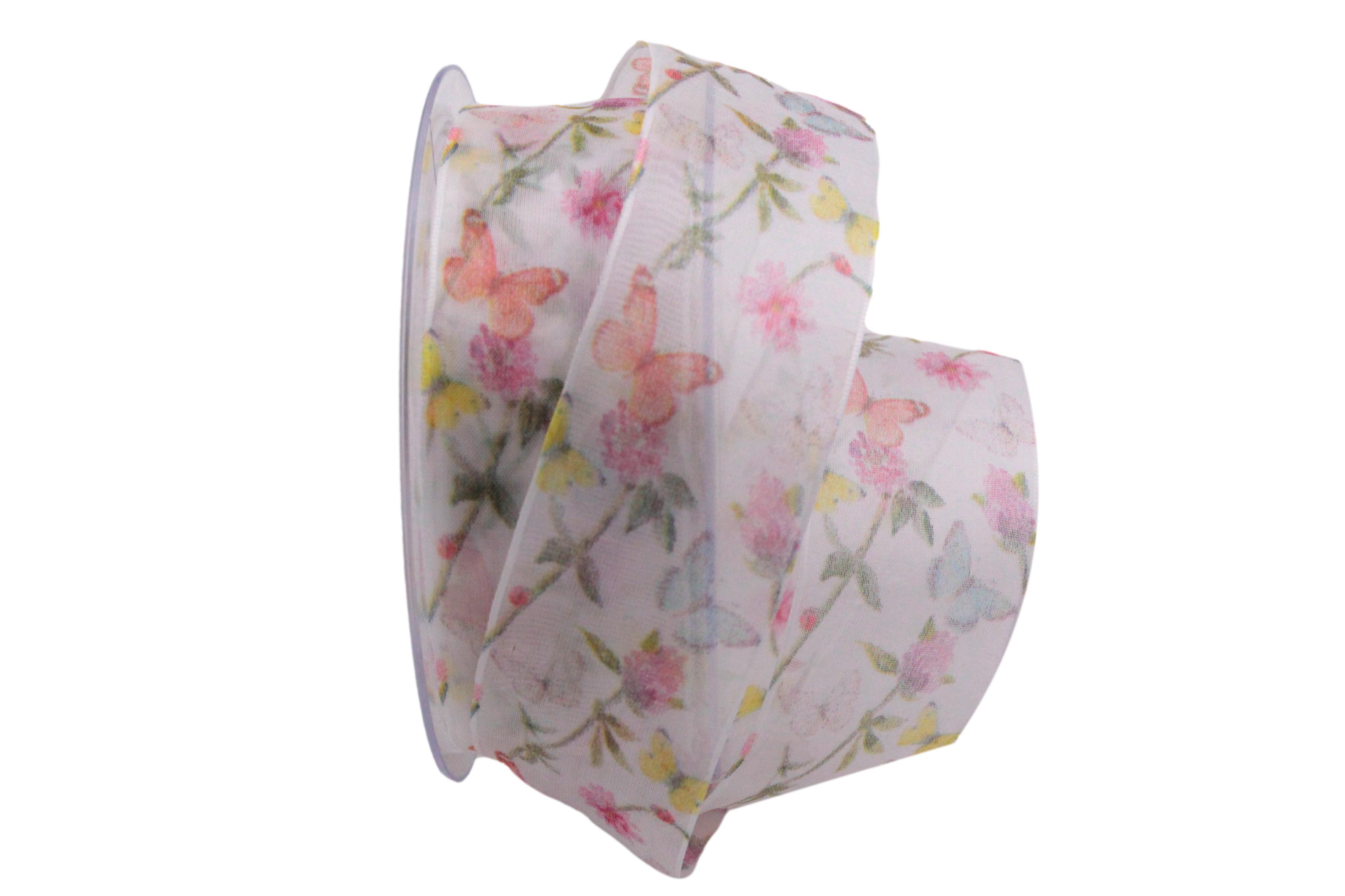 Ein sehr schönes, farbenfrohes Geschenkband mit Blumen und Schmetterlingsdruck. Dieses Organzaband mit Druck wirkt sehr schön fein aber trotzdem farbenfroh für jede Dekoration oder Verpackung in der Frühjahrs- und Sommerzeit