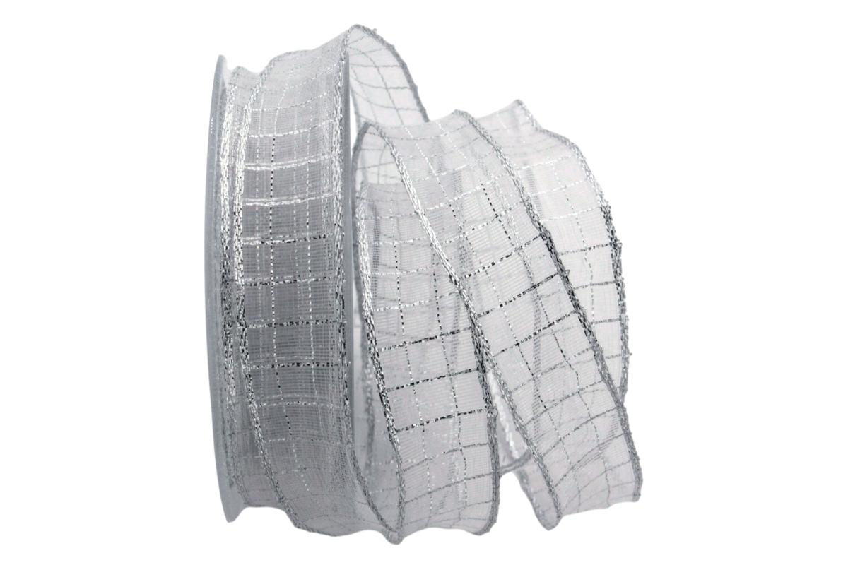 Ein Organzagitterband mit leuchtendem Lurexfäden und Silberkante. Dieses Dekoband mit Drahtkante lässt sich wunderbar zu schönen Schleifen verarbeiten.