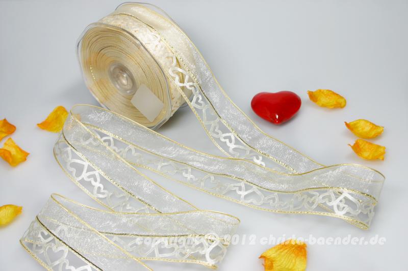 Ein sehr edles Dekorationsband mit ausgestanzten Herzen sowie Organzaelementen. Ideal für Hochzeiten und allen Anlässen mit Herz.