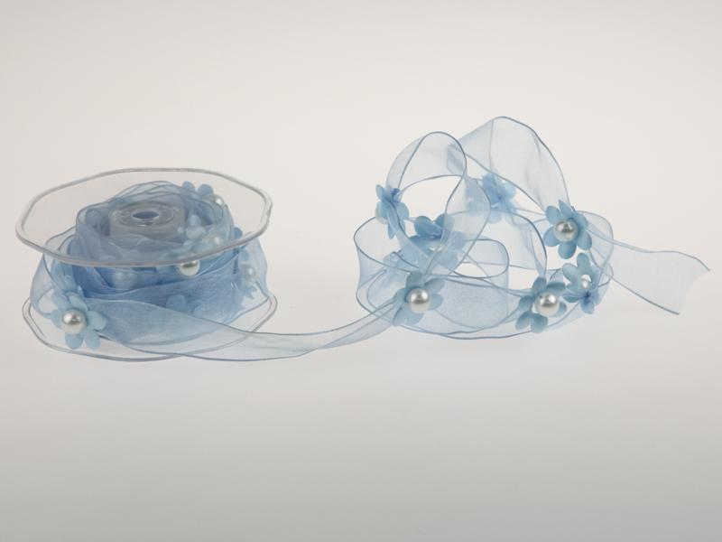 Eine Dekorationsgirlande mit duftiger Note. Bestehend aus einem Organzaband mit aufgenähten Blumen in deren Mitte eine Kunststoffperle aufgenäht ist.Sehr schön zum Dekorieren von frühsommerlichen Schaufenstern oder Auslagen oder auch für Fenster und Innendekorationen in Haus und Heim. .