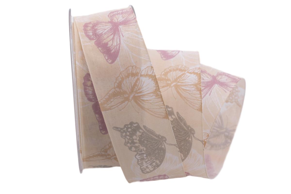 Ein Dekorationsband und Geschenkband mit aufgedruckten fröhlichen Schmetterlingen. Durch die seitliche Angelschnur kann man super schnell Schleifen binden, welche in Form und Qualität sehr stabil sind.