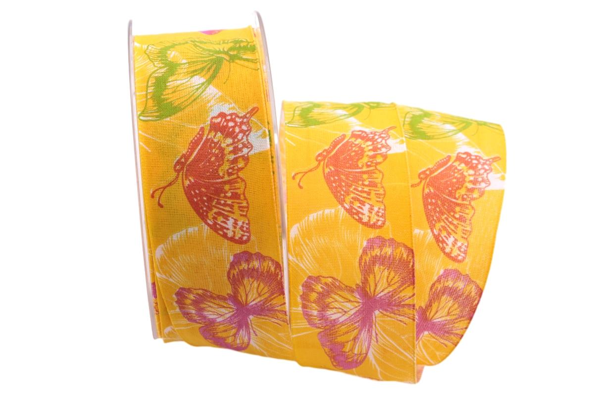 Ein Dekorationsband und Geschenkband mit aufgedruckten fröhlichen Schmetterlingen. Durch die seitliche Angelschnur kann man super schnell Schleifen binden, welche in Form und Qualität sehr stabil sind.