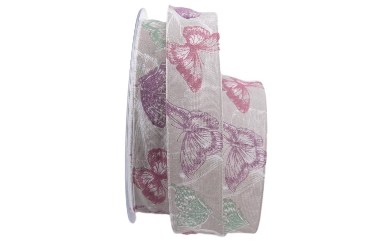 Ein Dekorationsband und Geschenkband mit aufgedruckten fröhlichen Schmetterlingen. Durch die seitliche Angelschnur kann man super schnell Schleifen binden, welche in Form und Qualität sehr stabil sind.