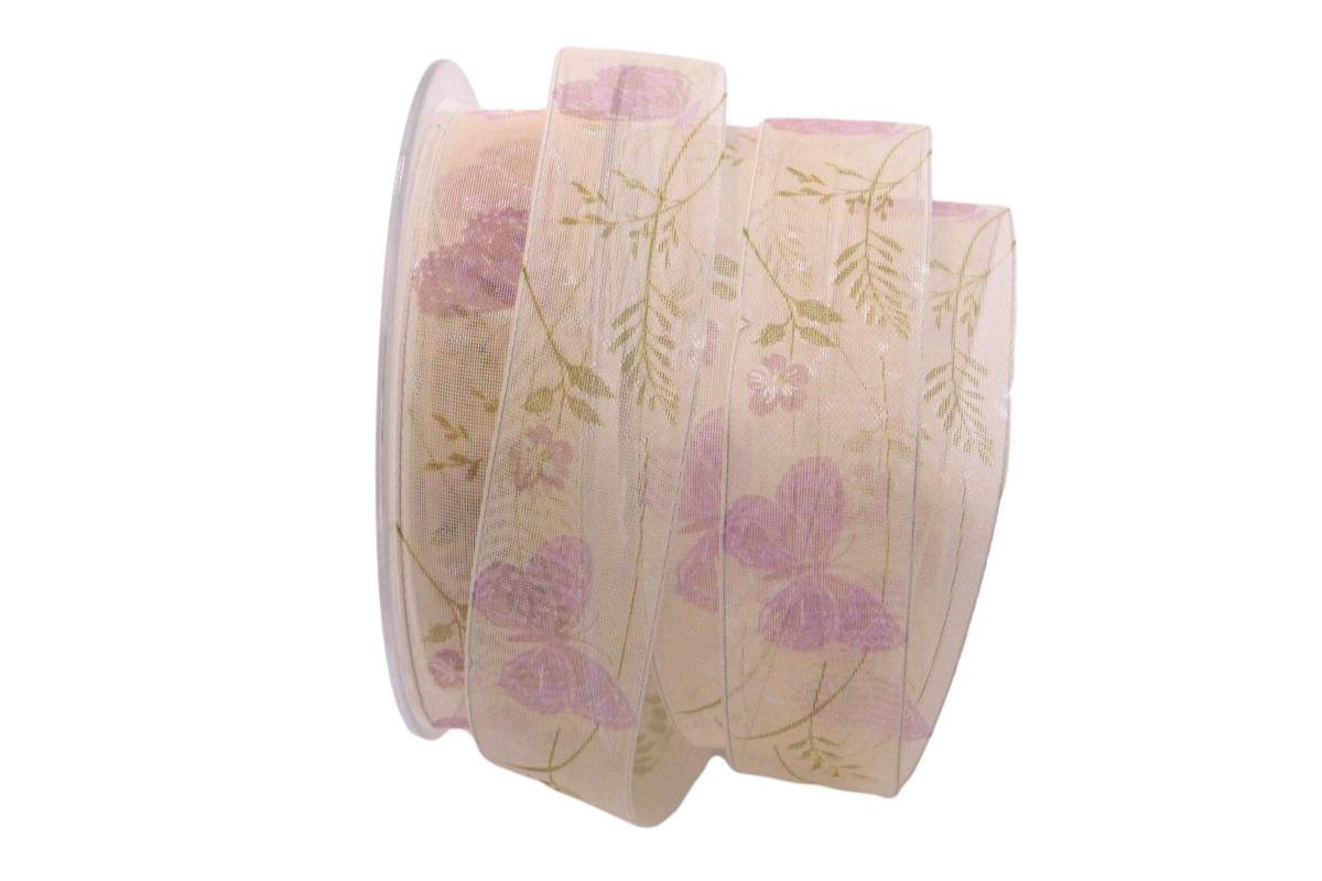 Ein sehr schönes, farbenfrohes Geschenkband mit Blumen und Schmetterlingsdruck. Dieses Organzaband mit Druck wirkt sehr schön fein aber trotzdem farbenfroh für jede Dekoration oder Verpackung in der Frühjahrs- und Sommerzeit