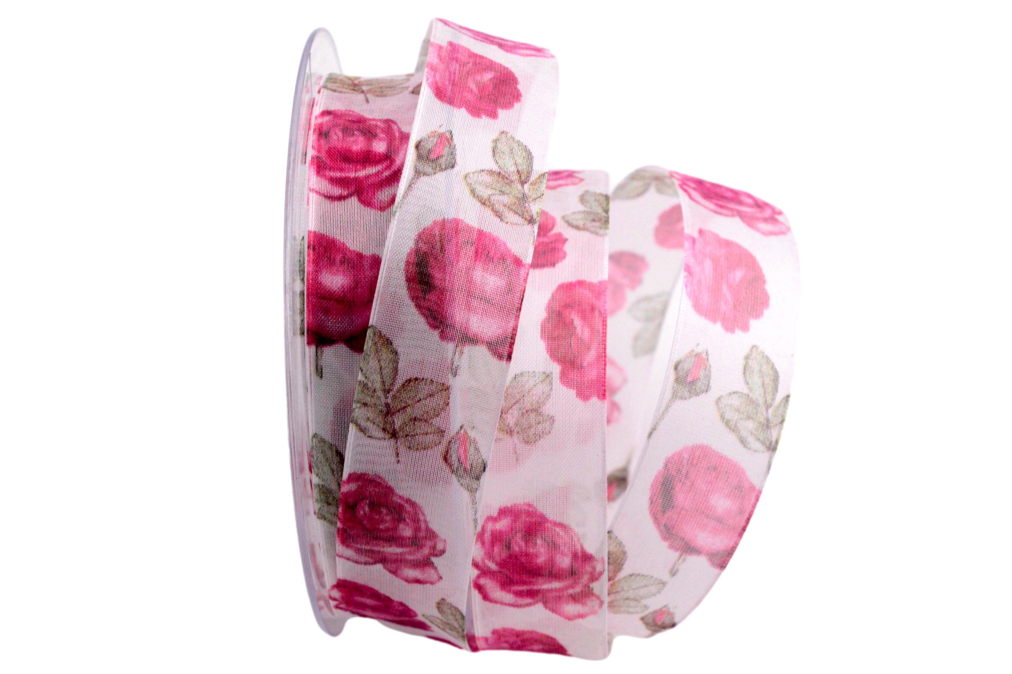 Ein sehr schönes, farbenfrohes Geschenkband mit Rosen und Blättern. Dieses Organzaband mit Druck wirkt sehr schön fein aber trotzdem farbenfroh für jede Dekoration oder Verpackung in der Frühjahrs- und Sommerzeit