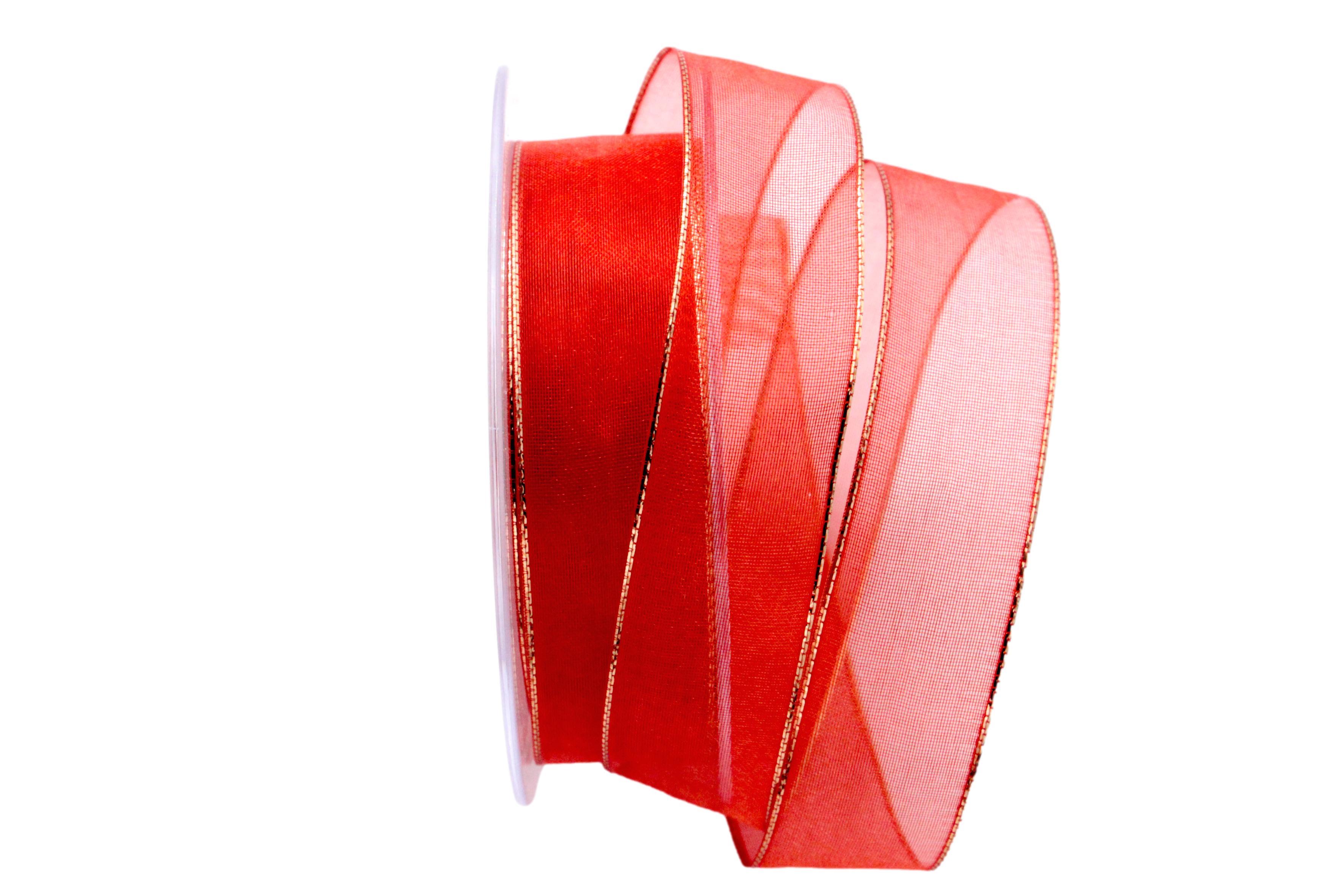 Länge: 20m Breite: 25mm Farbe: rot / Goldkante Material 100 % Polyester Ein einfaches aber farbenstarkes Organzaband mit seitlicher Drahtkante zum sensationellen Tiefpreis. Ideal für Bastler, Verpacker und Dekorierende