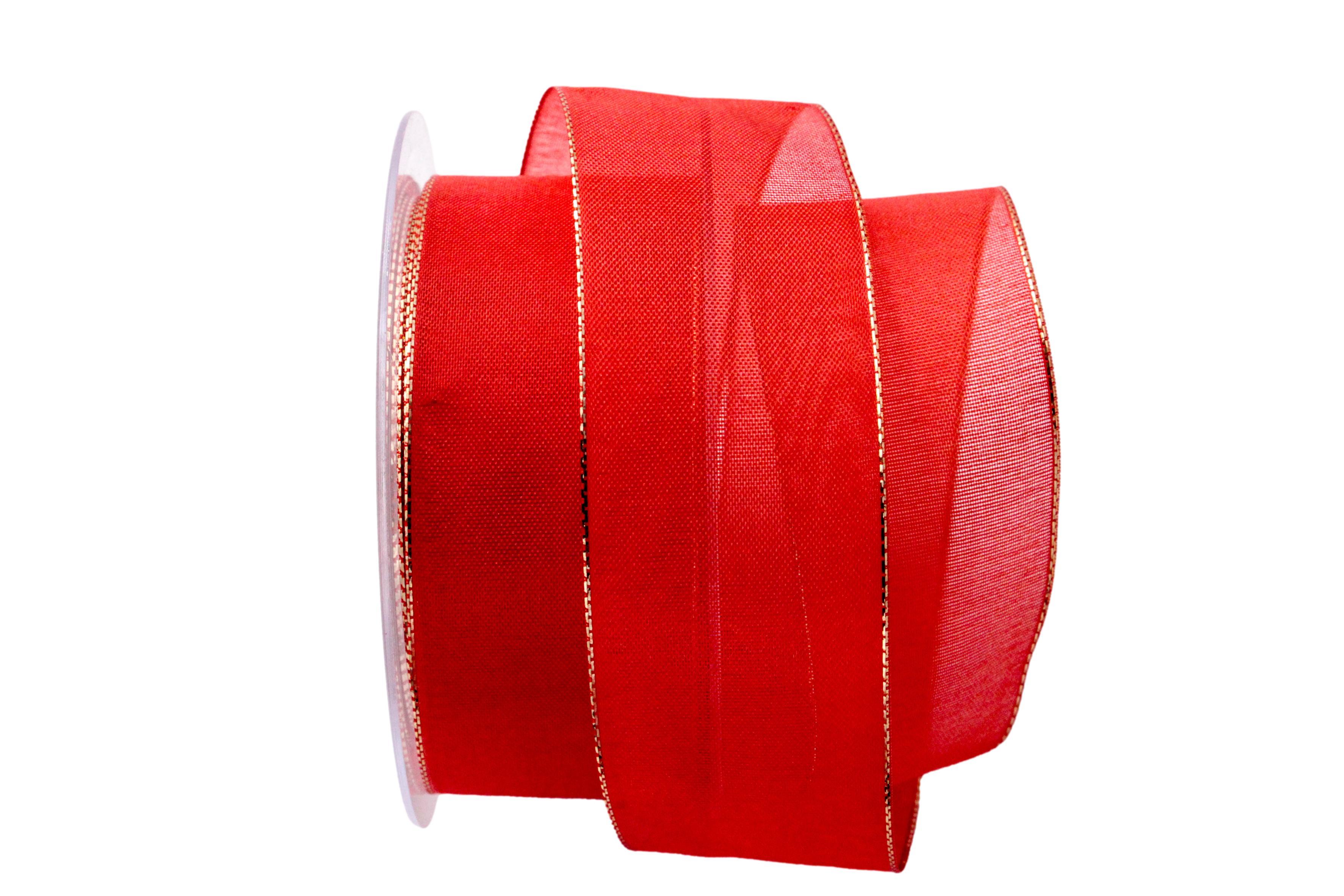 Länge: 20m Breite: 40mm Farbe: rot / Goldkante Material 100 % Polyester Ein einfaches aber farbenstarkes Organzaband mit seitlicher Drahtkante zum sensationellen Tiefpreis. Ideal für Bastler, Verpacker und Dekorierende