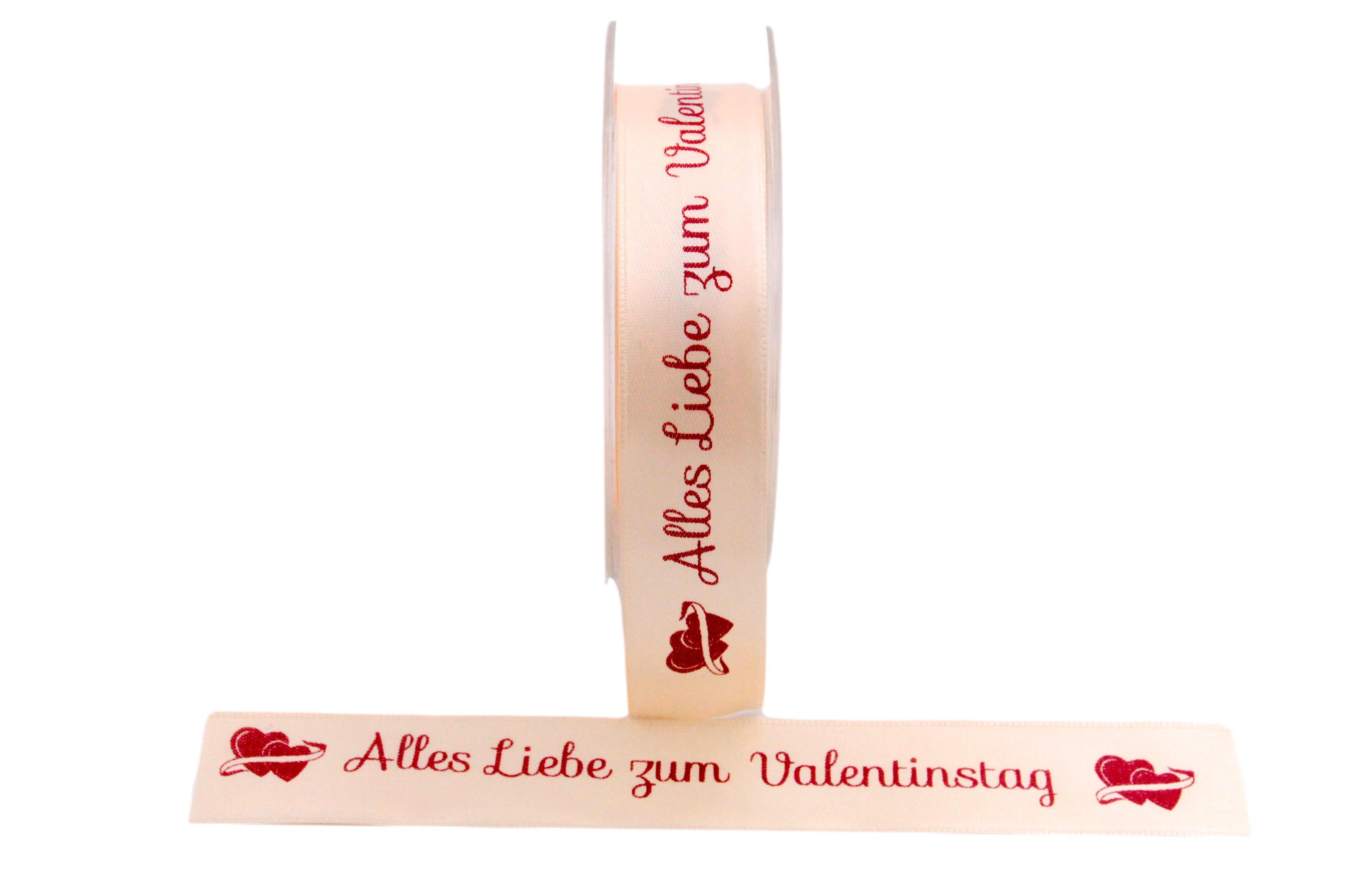 Ein Dekorationsband und Geschenkband mit dem Aufdruck: " Alles Liebe zum Valentinstag " Dieses Band ist schön für die Verpackung und Dekoration von Geschenken für alle Verliebten. Weitere Bandfarben und Schriftfarben jederzeit auf Anfrage möglich