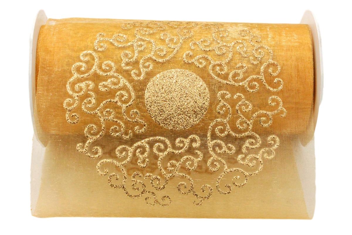 Ein breites Organzaband, mit aufwändiger Ornamentverzierung. Ideal als Tischband für die weihnachtlichen Auslagen und Schaufensterdekorationen.