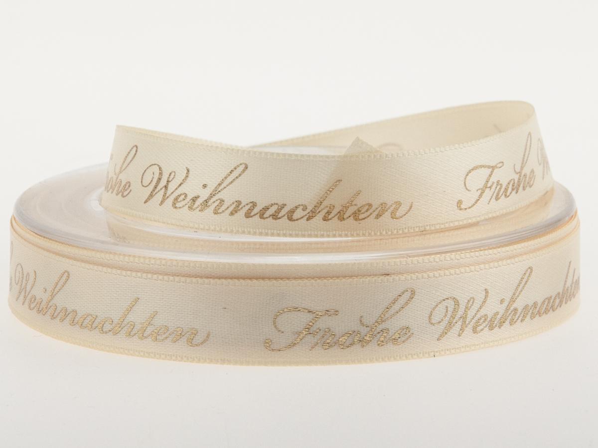 Ein Doppelsatinband mit der traditionellen Aufschrift "Frohe Weihnachten", geeignet zum basteln und für die Geschenkverpackung. Mit leichtem Seidenschimmer. Für Weihnachten ein geeignetes Band zum verschließen von Kekspackungen, Stollen und Geschenktüten.