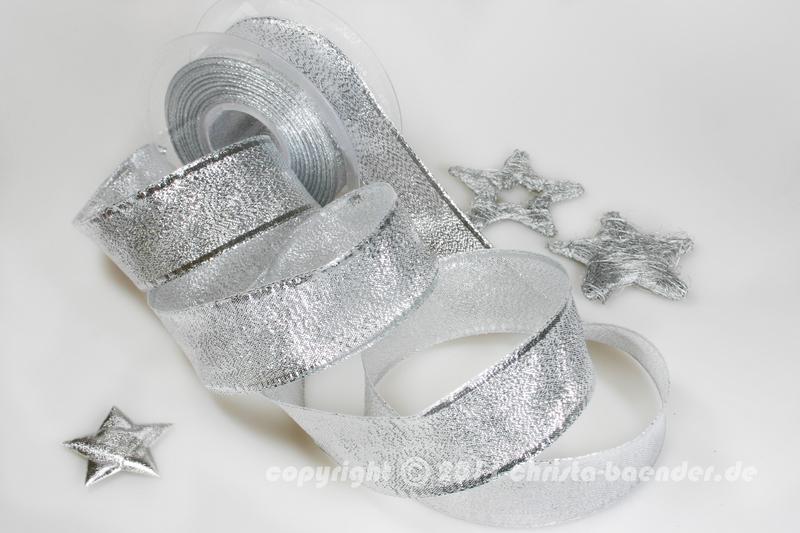 Ein sehr hochwertig verarbeitetes Silberband mit Drahtkante. Ideal zum kombinieren mit weihnachtlichen Motivbändern.