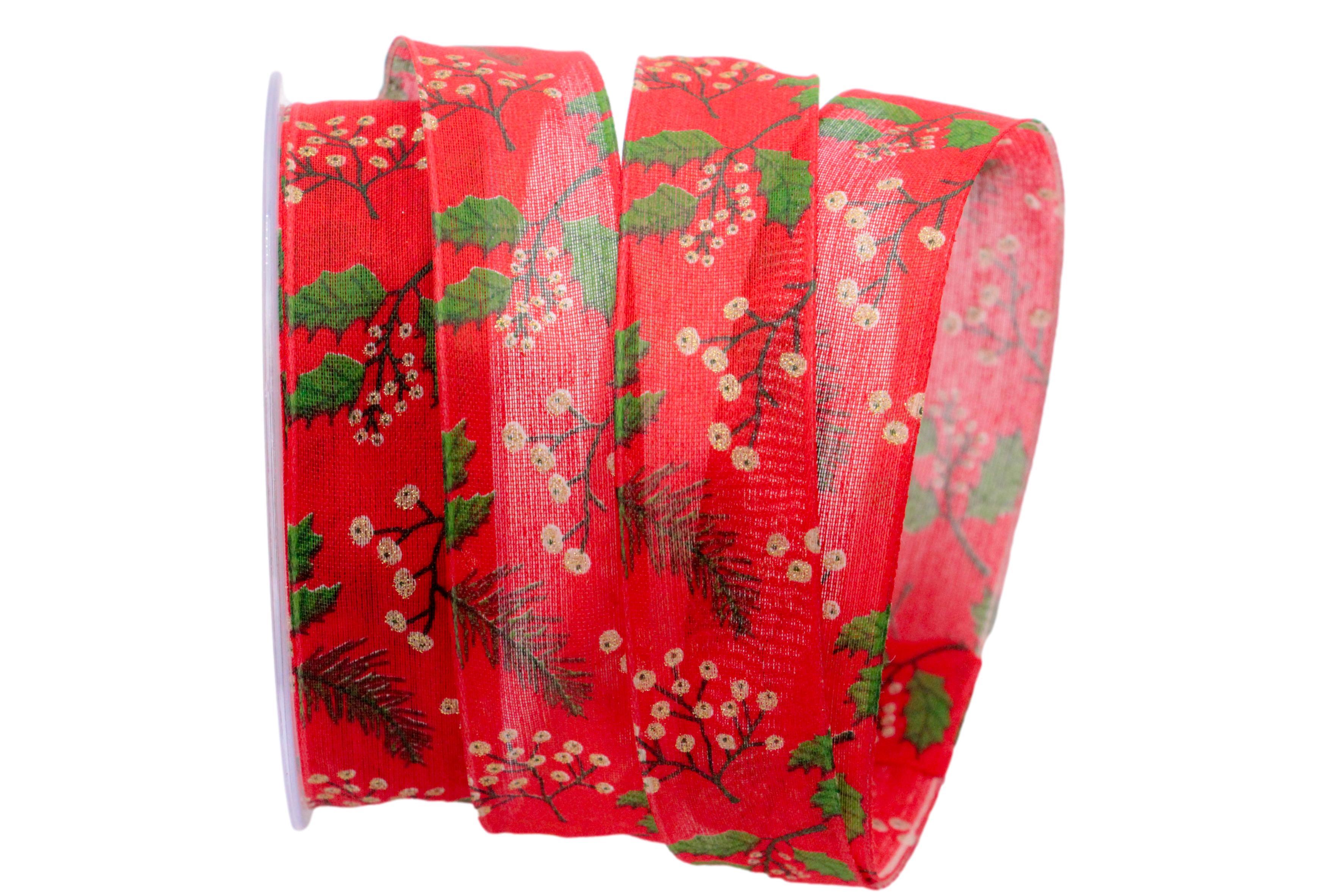 Ein traditionelles Weihnachtsband mit Mitstelzweigen bedruckt. Sehr schön in der weihnachtlichen Zeit für Verpackungen und Dekorationen.