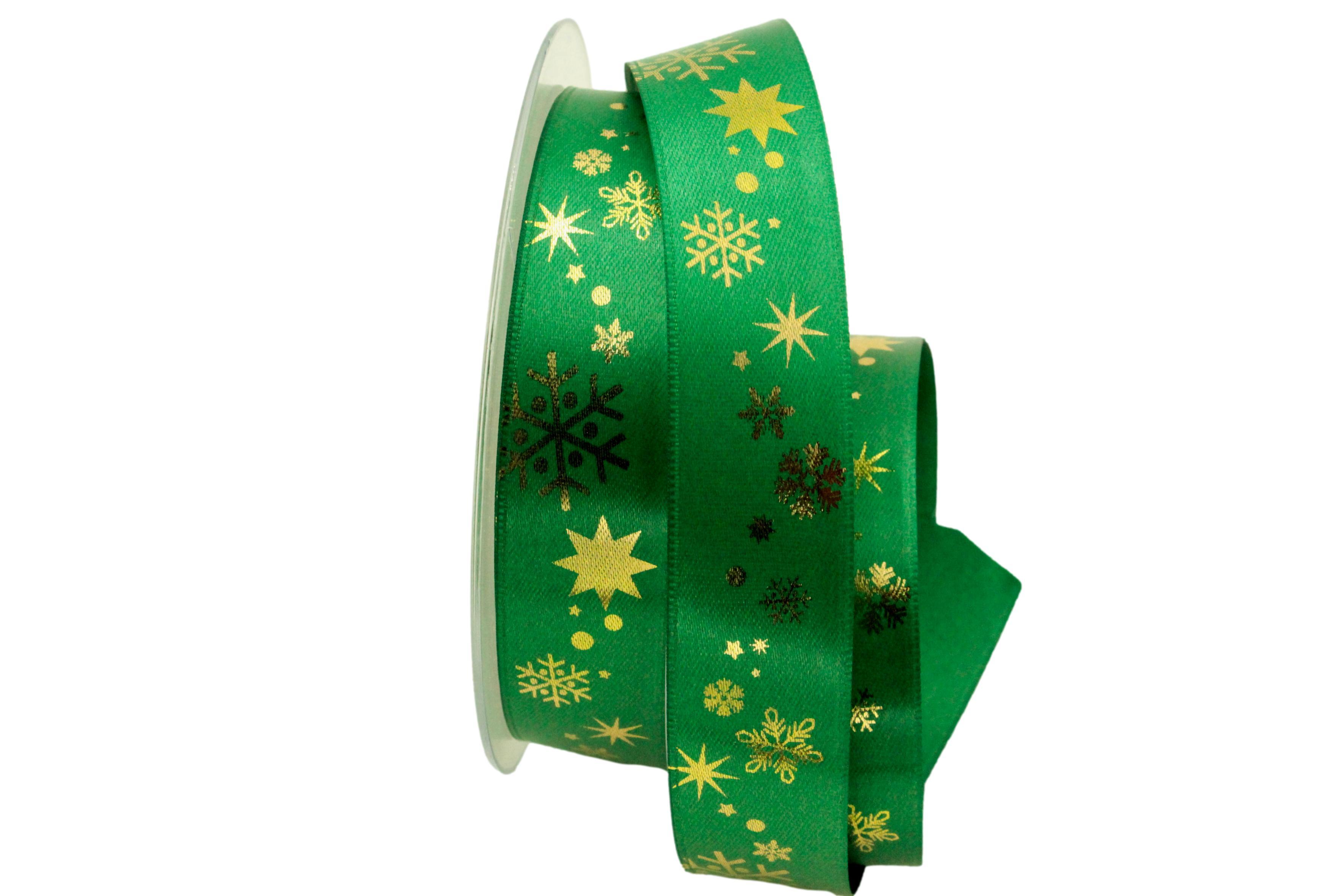Weihnachtsband Schneeflocken grün / gold 25mm ohne Draht