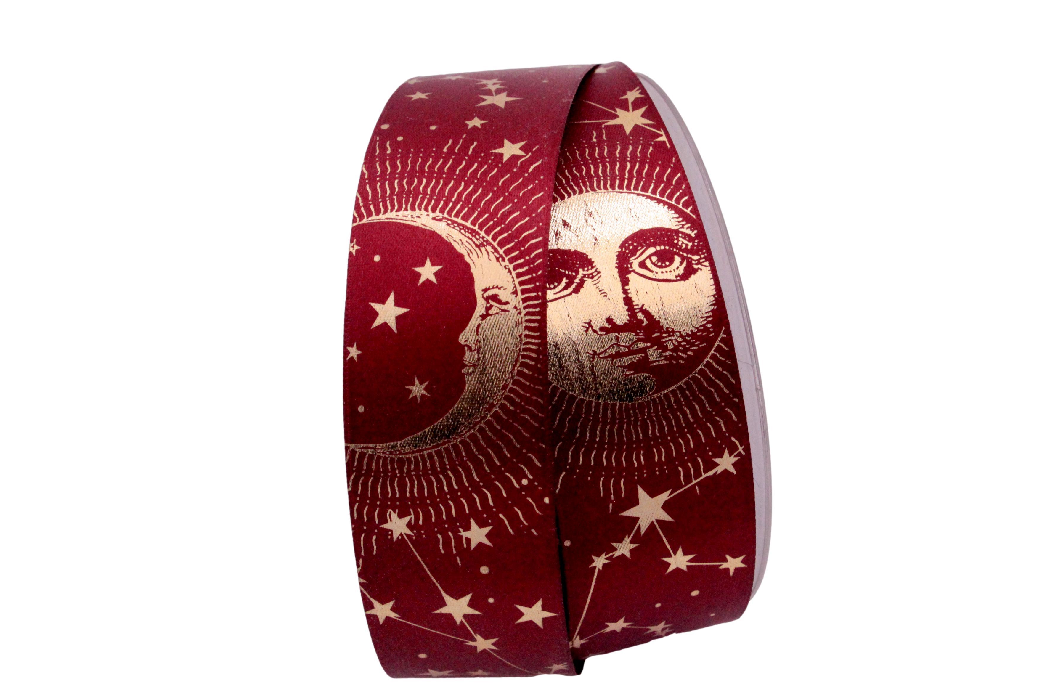Ein sehr edles bedrucktes Satinband mit Sonne Mond und Sterne. Ob zu Weihnachten oder zu anderen Anlässen, dieses Dekoband ist wunderschön in jeder Verpackung, Dekoration und Tischgestaltung.