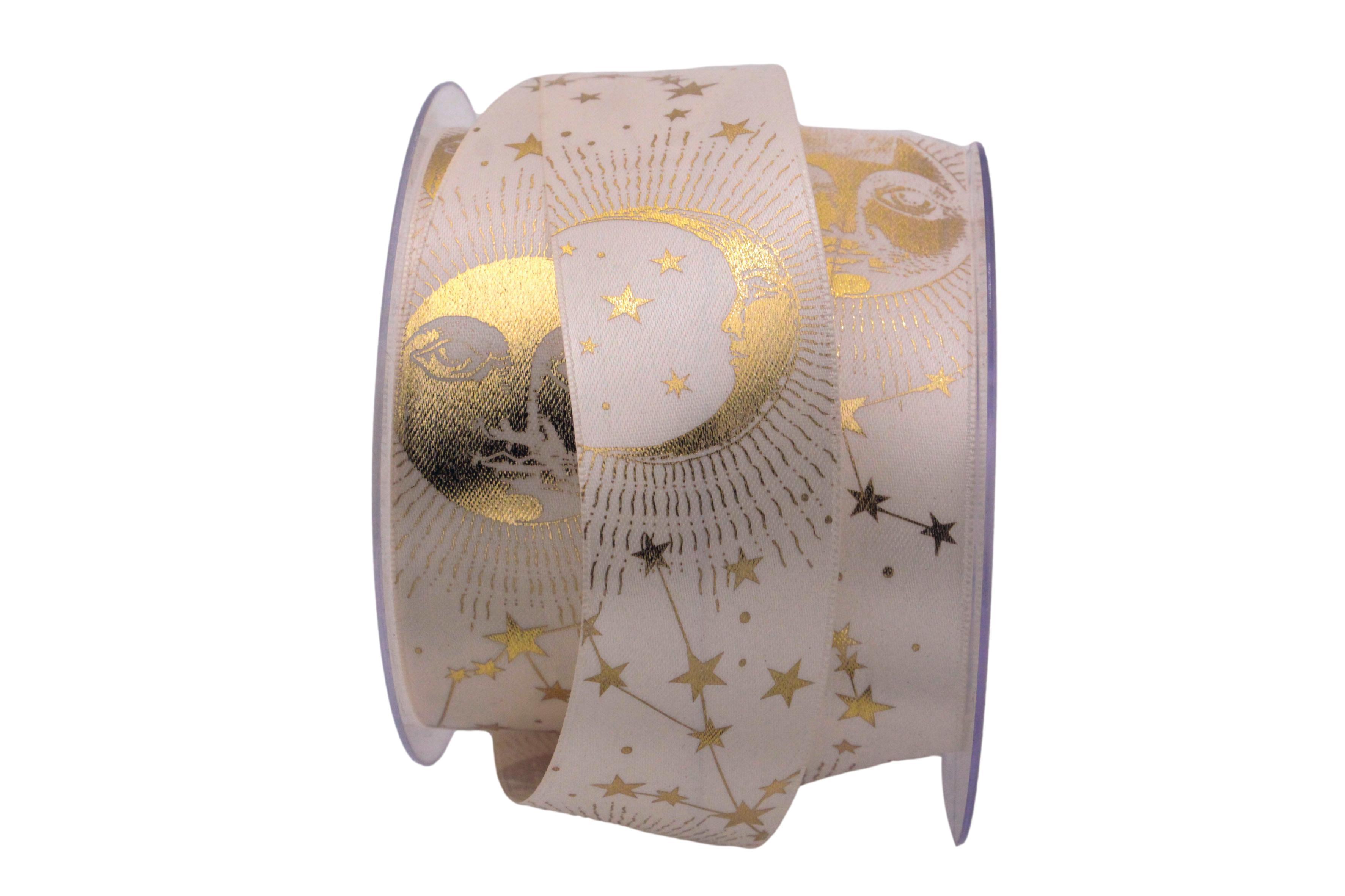 Ein sehr edles bedrucktes Satinband mit Sonne Mond und Sterne. Ob zu Weihnachten oder zu anderen Anlässen, dieses Dekoband ist wunderschön in jeder Verpackung, Dekoration und Tischgestaltung.