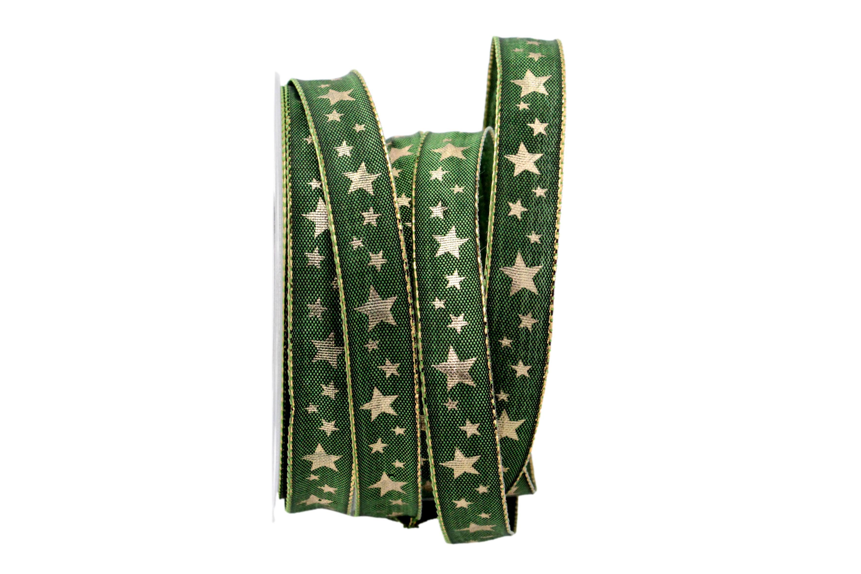 Weihnachtsband Sterne Grün/Gold mit Draht 15mm
