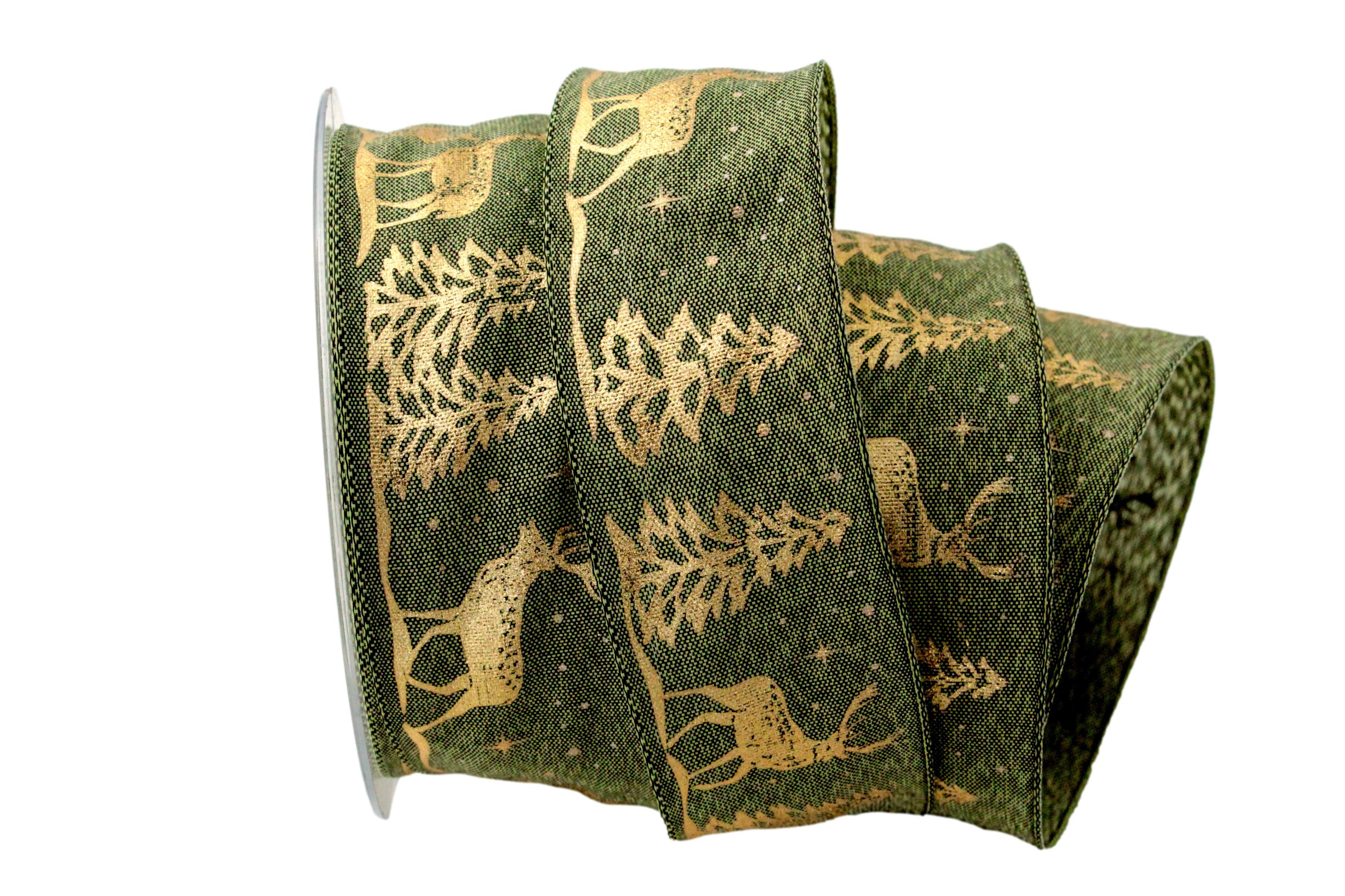 Weihnachtsband Wald und Hirsch grün olive 40mm mit Draht